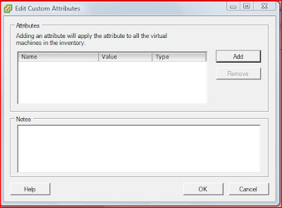 Note: Adding a custom attribute to one Host or Virtual Machine will add that attribute to all like systems. It does NOT populate the value for this attribute on other systems however. This is still our responsibility. Likewise if you delete an attribute it will also remove it and all values from like systems. These values are stored in the vCenter database and could possibly be recovered from your database backup. I have not tried testing this but have verified that the data is there and reference the VM in tables VPX_FIELD_DEF and VPX_FIELD_VAL.